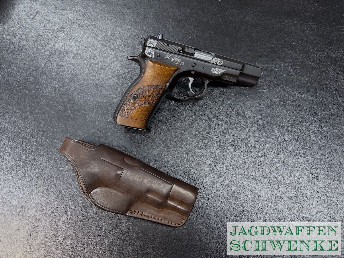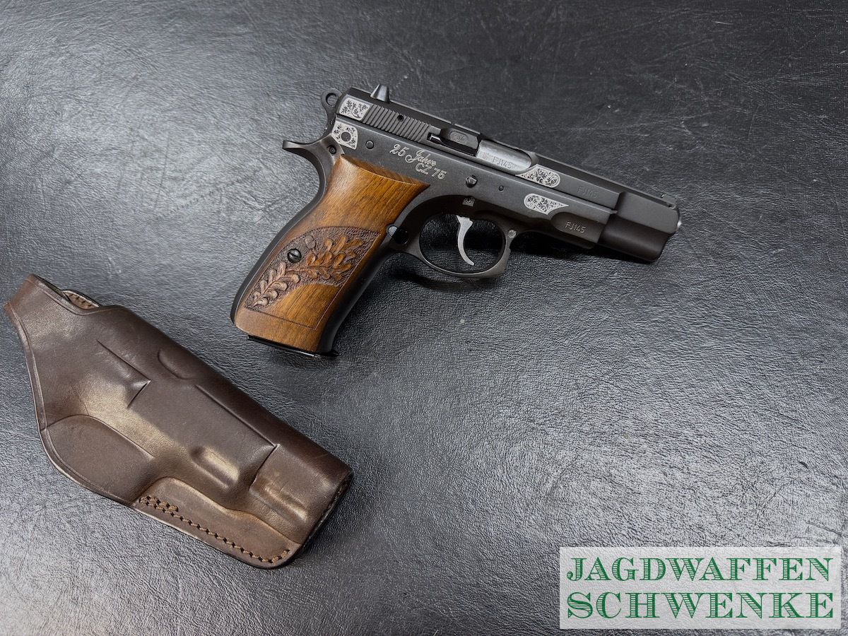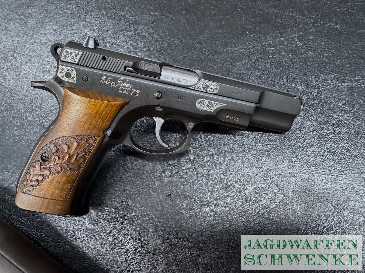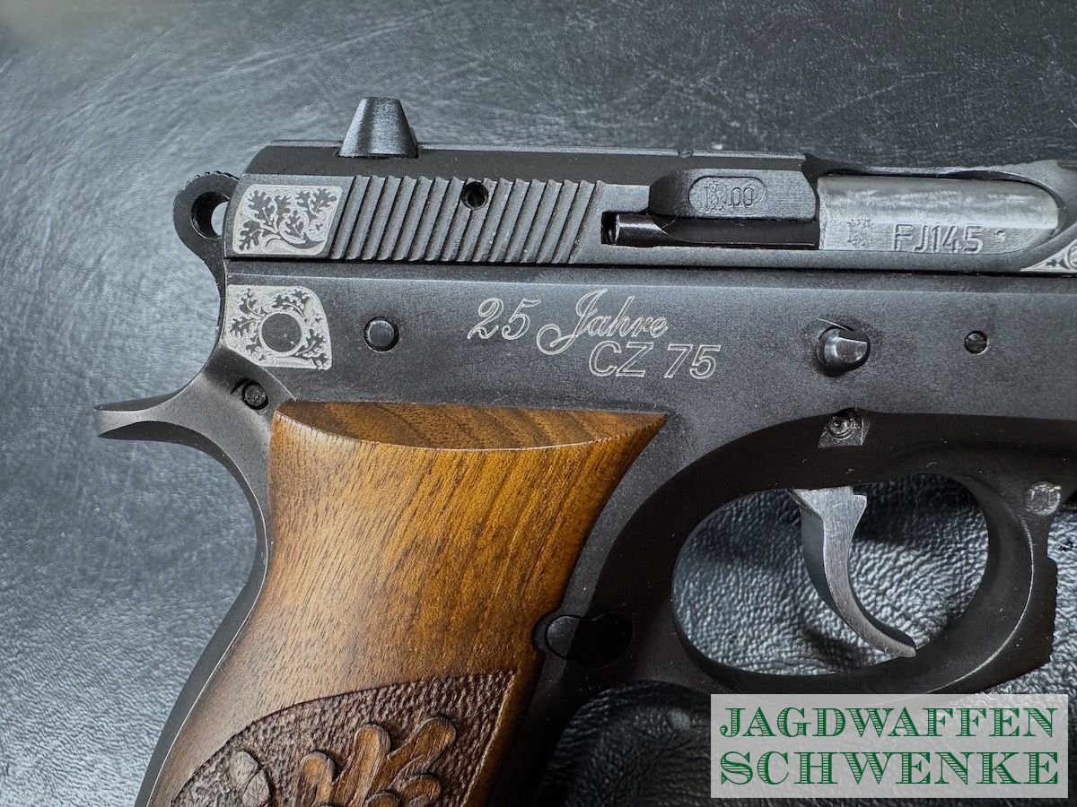 Seltene Sonderedition der PÜistole CZ 75 zum 25. Jährigen Jubiläum mit Gravur und Handgearbeiteter Griffschalen Verschneidung.
