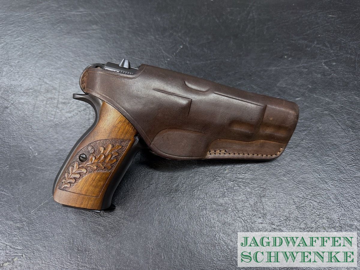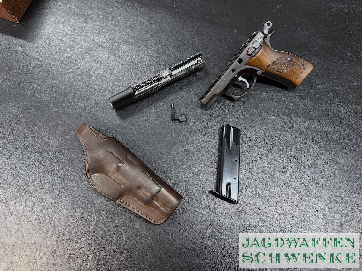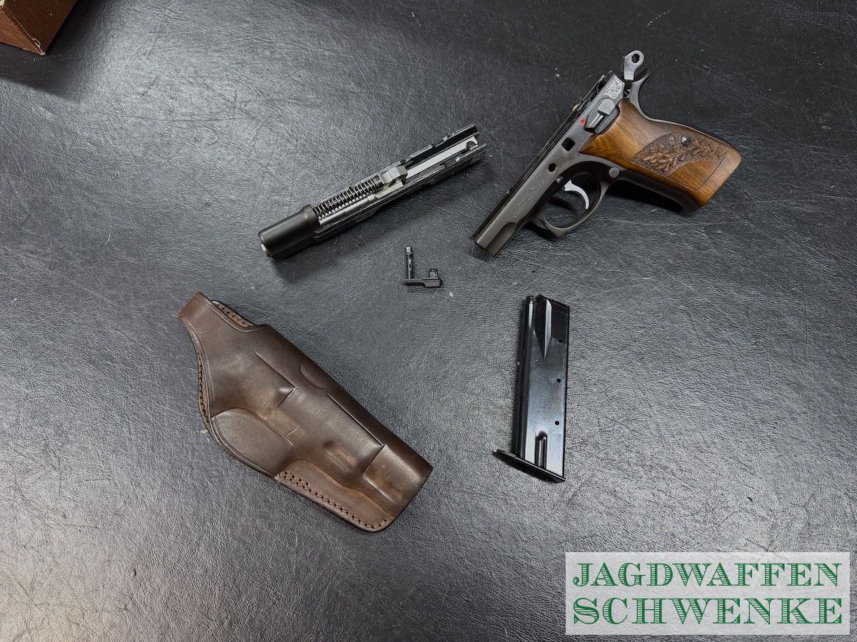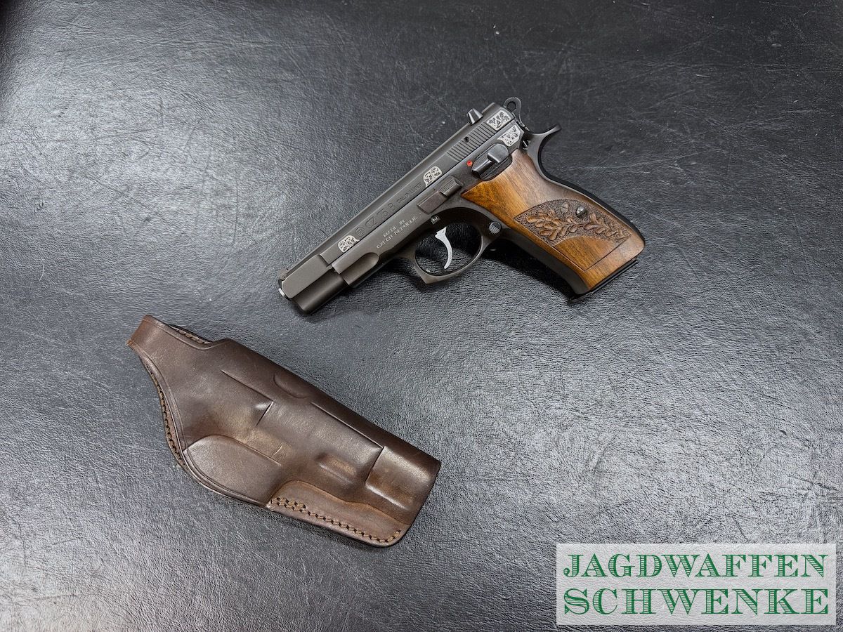 Seltene Sonderedition der PÜistole CZ 75 zum 25. Jährigen Jubiläum mit Gravur und Handgearbeiteter Griffschalen Verschneidung.